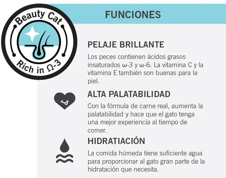 Notarás rápidamente cómo su pelaje se transforma, volviéndose más brillante y suave gracias a los ácidos grasos esenciales Omega-3 y Omega-6 y al poder antioxidante de las vitaminas C y E. Además, la fórmula húmeda asegura una hidratación profunda que cuida de manera natural sus riñones y vías urinarias.