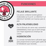Su fórmula "Beauty Dog", rica en Omega 3 y 6, y vitaminas, trabaja activamente para conseguir un pelaje visiblemente más brillante y una piel sana.